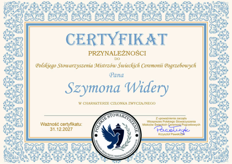 Jestem Prezesem Polskiego Stowarzyszenia Mistrzów Świeckich Ceremonii Pogrzebowych i rekomendowanym Mistrzem Ceremonii Polskiego Stowarzyszenia Pogrzebowego. Podczas pogrzebu, staram się być „ustami rodziny” zmarłego. Zawsze dbam o należyty przebieg ceremonii, podczas której najważniejsze jest wspomnienie zmarłego, oddanie mu hołdu w trakcie wygłaszania laudacji, chwila zadumy, jak i godne odprowadzenie zmarłego na wieczny odpoczynek.